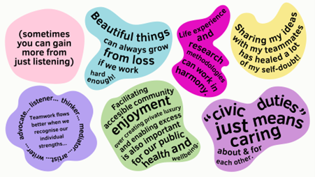 After compiling our interviews, it was time to identify repeated ideas to create key themes. We cut out transcripts of our interviews and physically sorted them into categories, like a cut-and-paste game of thematic analysis. It was interesting to debate how different experiences could all fit into overarching themes…
